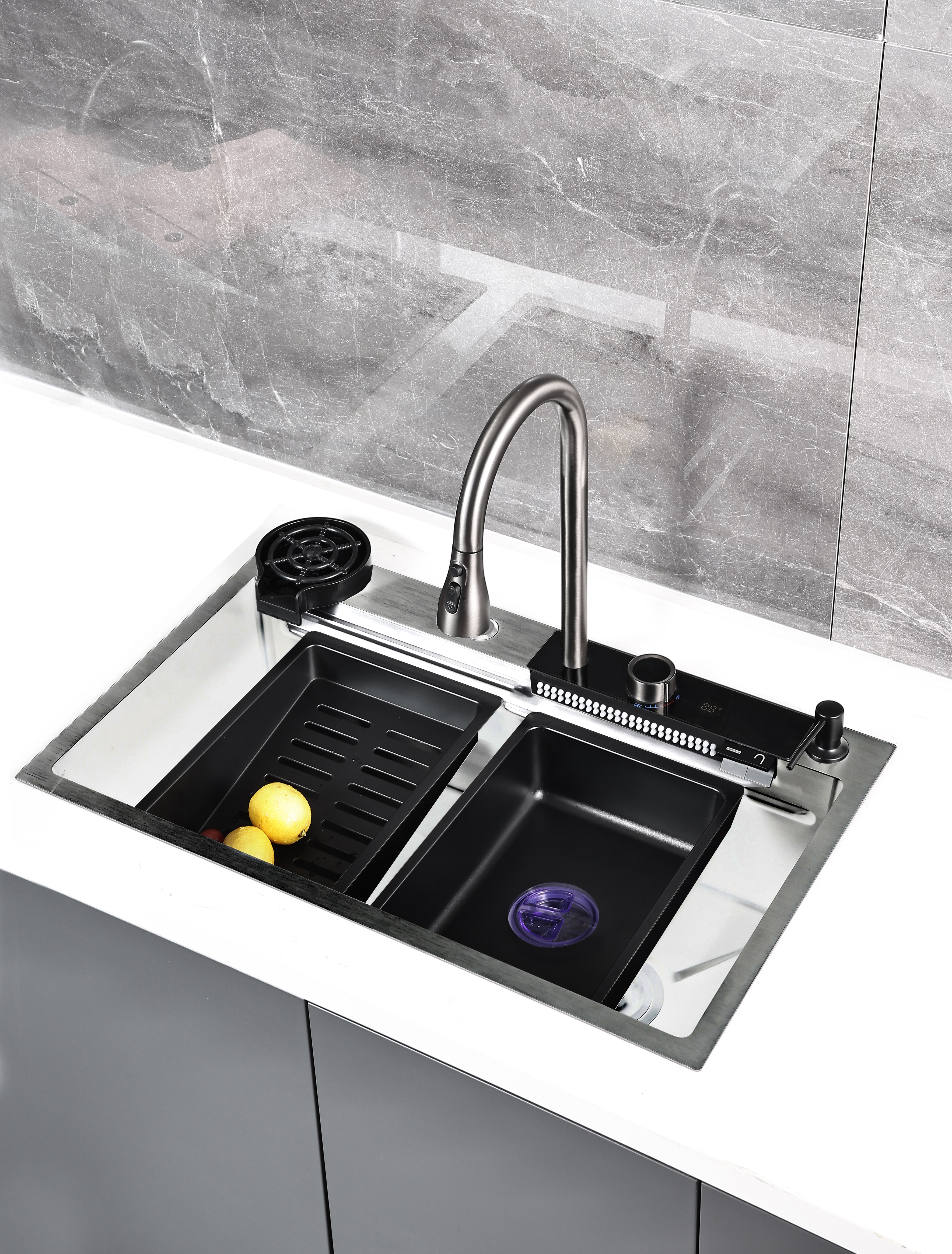 Мойка: материал нержавеющая сталь 1 мм, поверхность матовая, цвет нержавеющая сталь. Панель-смеситель, цвет черный. Функции: фронтальный душ, индикация температуры, амбиентная подстветка. Излив с выдвижной лейкой, 3 режима, цвет графит. Выпуск с мусоросборником. Дозатор для моющего средства. Ринзер нажимной (мойка стаканов). Колландер - 2 шт. Доска разделочная. Сифон, гофра. Гибкая подводка для воды и смесителя. Кран угловой - 2 шт.