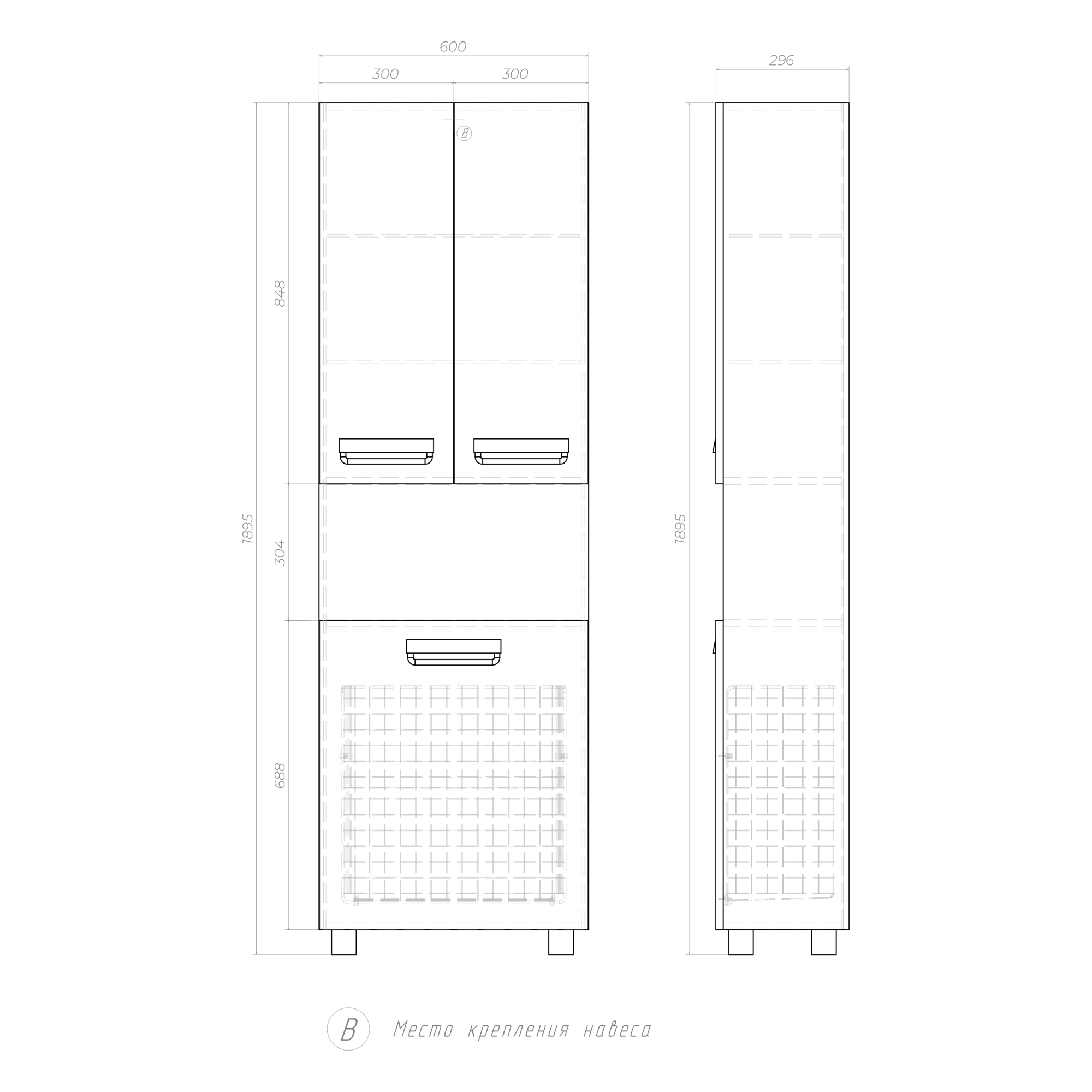 2 дверцы; 1 ящик с бельевой корзиной;