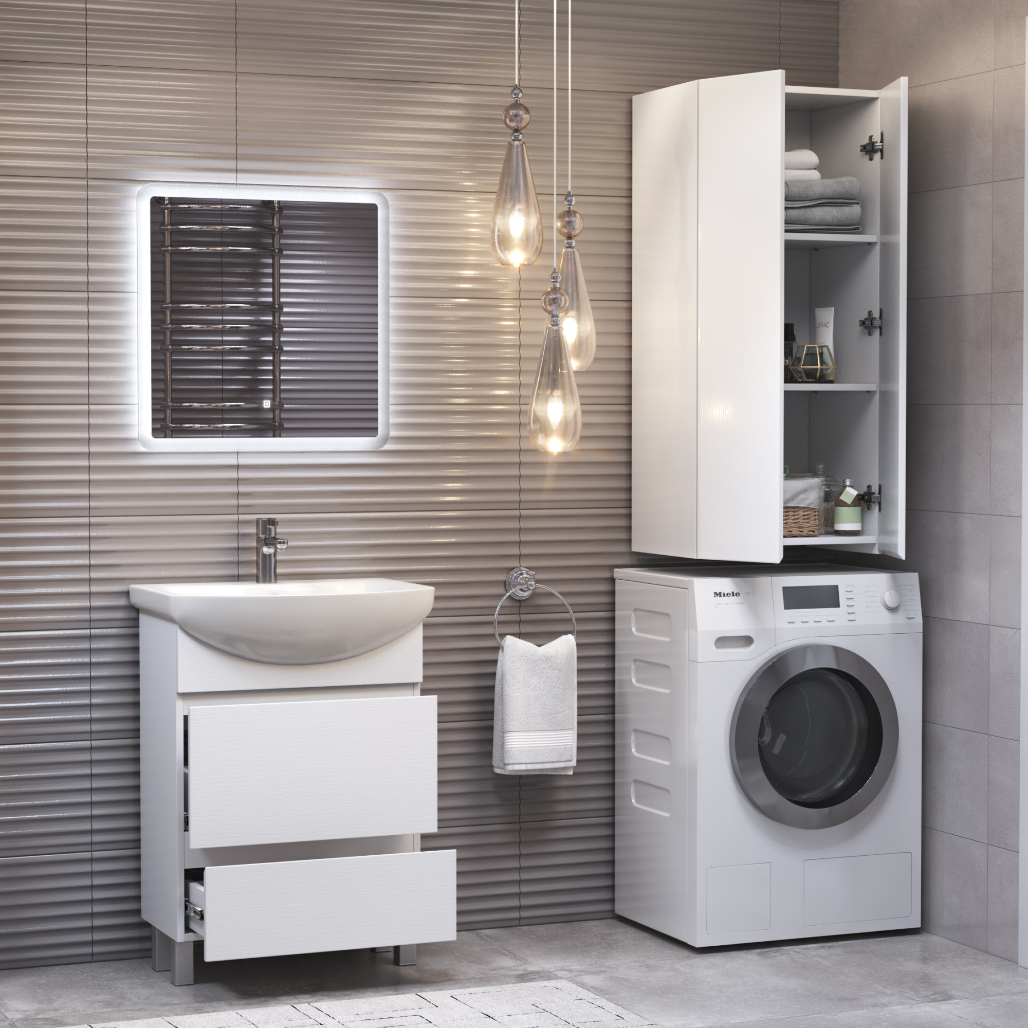Шкафы Wing – идеальное решение, позволяющее сэкономить пространство ванной комнаты за счет размещения над стиральной машиной. Петли с доводчиком. Функциональная глубина полок 320мм. Декор материала "структура дерева".