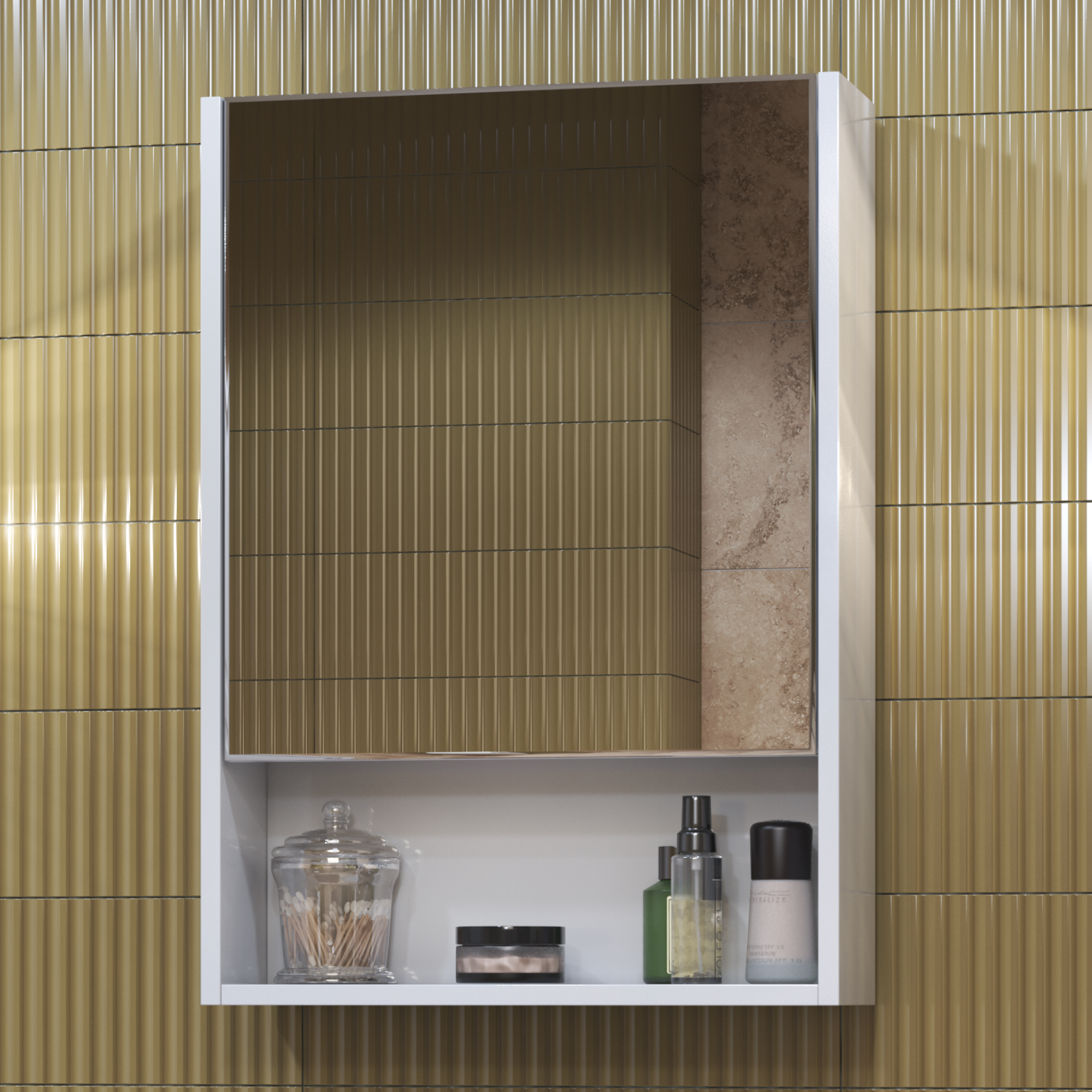 корпус шкафа, 1 дверца, петли с механизмом доводчика, зеркало с фацетом, 2 полки ЛДСП, 1 открытая полка снизу
