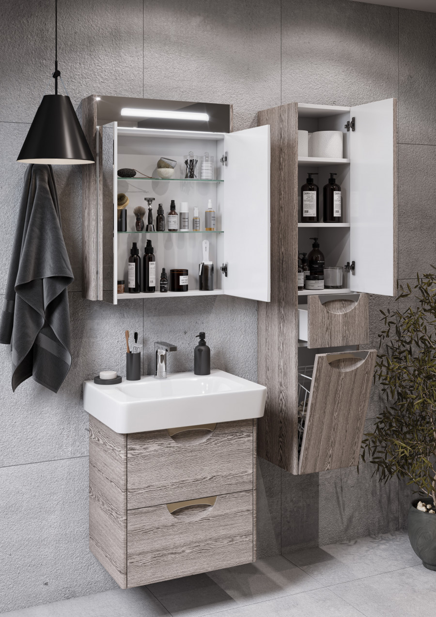 В подвесном шкафе-колонне Сильва оптимально сочетаются функциональность, тепло древесных мотивов и современный дизайн. Фасады и боковые стенки выполнены из МДФ в пленке цвета "дуб фьорд", а корпус - из влагостойкой ЛДСП. Подвесная колонна состоит из двух отделений и выдвижного ящика мягкого закрывания, который бесшумен и комфортен в использовании. Пространство верхнего отделения организовано с помощью двух регулируемых полок, в нижнем отделении встроена вместительная бельевая корзина. Петли данного шкафа расположены справа. Врезные ручки - в отделке "глянцевый хром".