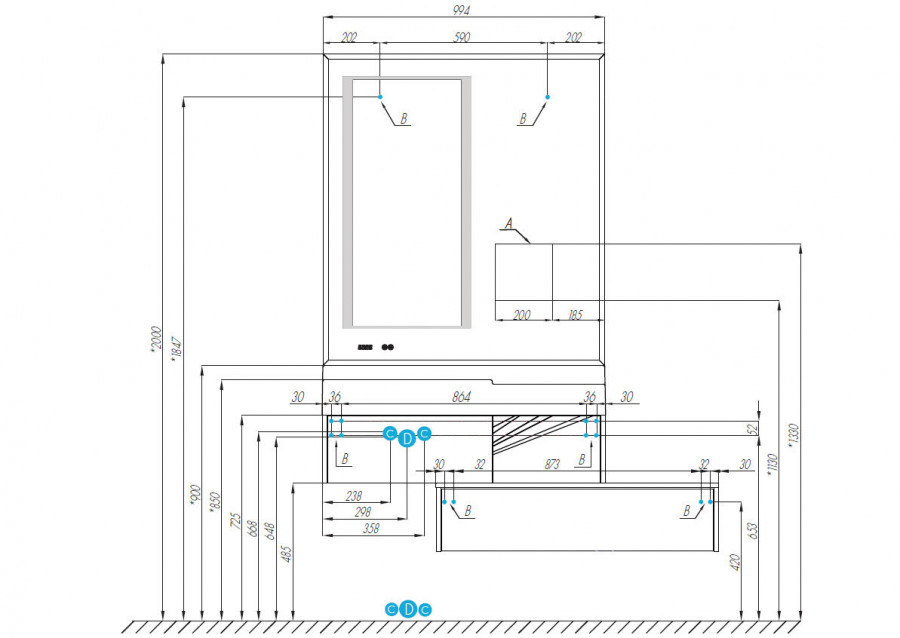 Зеркало 1шт., LED-подсветка, touch выключатель - 1, система ANTI-STEAM - 2, часы (встроенные за зеркалом) - 1, навес - 2